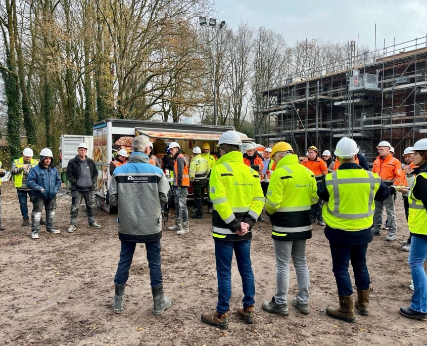 Op de bouwplaats namen we samen met onze collega’s en onderaannemers een moment om hierbij stil te staan. Natuurlijk kon een frietje met snacks niet ontbreken.